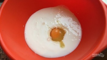 2. Яйцо заранее достаньте из холодильника, вбейте его в миску к кефиру.