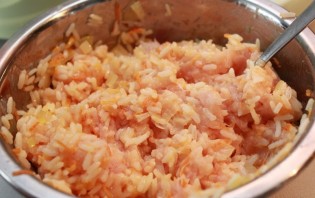 1. First, prepare the base. Boil rice in salted water for about 5 minutes. Wash the chicken fillet, pass it through a meat grinder, and mix with the rice. Peel the onion and cut into small cubes. Place in a frying pan and sauté slightly. Then add grated carrot and sauté as well. Mix thoroughly, adding salt and pepper to taste.