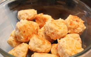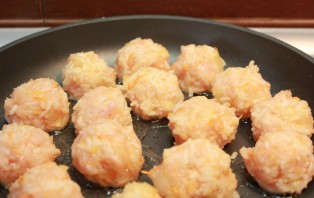 3. Prepare a heatproof dish and transfer the fried balls into it. If desired, a regular saucepan can be used in the recipe for cooking rice with chicken mince, so that instead of baking, the dish can be simmered on the stovetop.