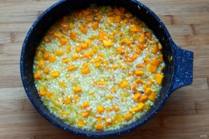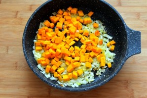 In a deep sauté pan with olive oil, sauté diced onion and pumpkin. Stir frequently and avoid browning too much.