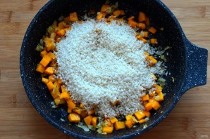 Add the rice to the vegetables and stir until the grains are coated with oil.