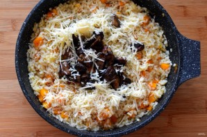 After about 20 minutes, taste the rice. If it is almost done, add some thyme to the dish, then place the fried mushrooms and grated Parmesan on top. Stir gently, remove the risotto from the heat, and let it rest, covered, for about 7 minutes.