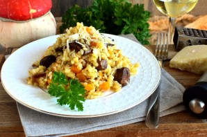 The recipe won't take much time. The most important thing in preparing risotto is to choose the right rice and never overcook the dish! The rice grains should be slightly firm in the very center—famous Italian al dente! Before you start cooking, bring the chicken broth to a boil and leave it on the stove, keeping it at a gentle simmer. You must add this simmering broth to the risotto gradually, without letting the temperature drop. Serve hot.