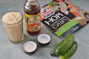 Спустя время нарежьте огурцы тонкими ломтиками, сердцевину желательно вырезать. Лист нори разрежьте пополам, смачивая ложку и руки в воде, выложите на нори рис, оставив 1 сантиметр свободным с противоположного края.