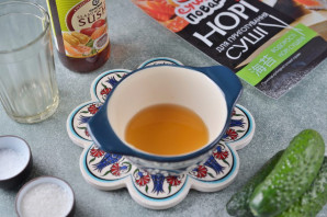А пока приготовьте заливку для риса. Для этого влейте в маленькую пиалочку рисовый уксус, всыпьте соль и сахар, поставьте на 15 секунд в микроволновку. Размешайте кристаллы соли и сахара чайной ложкой.