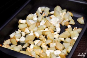 Meanwhile, place the diced potatoes and cheese into a greased baking dish. Bake the ingredients at 180 degrees until golden brown.