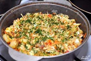 Then add sour cream, mix everything well again. Sprinkle with herbs on top and simmer over medium heat for about 5 minutes.