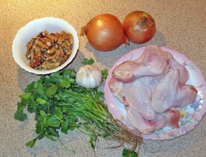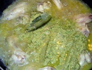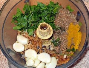 While the chicken is simmering, prepare the sauce. In a blender, grind the nuts, herbs, and garlic, then add coriander, cinnamon, red and black pepper, and khmeli-suneli.