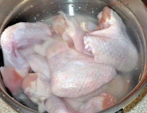 Place the wings in water, bring to a boil, and skim off the foam. Cook for about 15 minutes, then remove the wings and discard the broth.