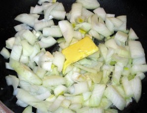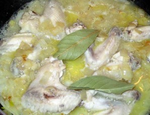 Then add the wings. Fry for about 15 minutes, then add the bay leaf and pour in a glass of broth. Simmer over low heat.