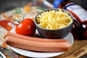 На крупной терке натрите сыр, сосиски, нарежьте тонкими кружочками помидор.