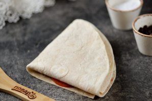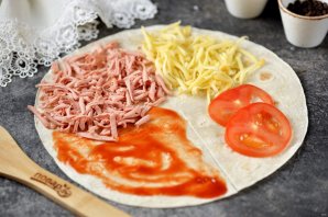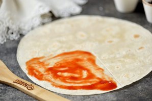 Выложите тортилью на плоскую поверхность, сделайте с одной стороны надрез до середины лепешки. Часть лепешки смажьте томатным соусом.
