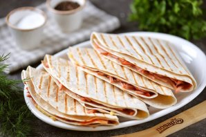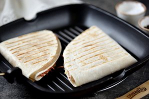Выложите сэндвичи из тортильи в сковороду-гриль и поджарьте с обеих сторон до легких подпалин. Сыр должен хорошо прогреться и расплавиться.