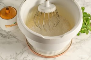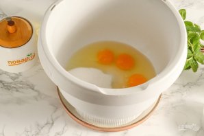 Вбейте куриные яйца в чашу кухонного комбайна или миксера, всыпьте соль и сахарный песок. По желанию можете всыпать щепотку ванильного сахара или ванилина. Взбейте все на самой высокой скорости техники примерно 3-4 минуты.