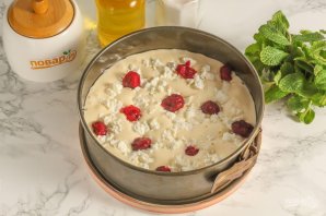 Разогрейте духовку до 180 градусов. Смажьте форму растительным или сливочным маслом по дну и по ее бокам. Выложите приготовленное тесто. На него выложите вишню и раскрошенный творог любой жирности. Выкладывайте именно на тесто, а не на дно формы, иначе шарлотка не пропечется снизу и останется влажной на дне.