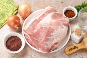 Подготовьте все ингредиенты. Мясо можете взять на свой выбор, у меня — свиная шея. В качестве специй я взяла готовую смесь для шашлыка.
