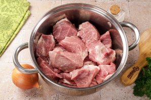 Мясо промойте и обсушите. Нарежьте свиную шею кусками. От размеров этих кусков будет зависеть, как быстро шашлык промаринуется и приготовится.
