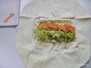 Lay the lavash on the work surface. Generously spread sauce in the center. Arrange cabbage, tomato, and cucumber on top.