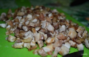 4. Place a frying pan over heat, pour in a little sunflower oil and heat it. Add the pieces of meat to the heated surface and fry until golden brown. Transfer to a cutting board and finely chop.