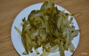 8. I slice the pickled cucumbers into thin strips and transfer them to a bowl.