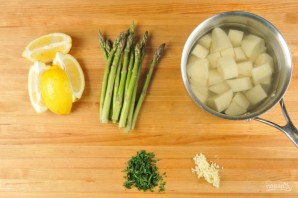 1. First, peel and cut the potatoes into large cubes. Boil them in water for 20 minutes. Finely chop the parsley and garlic. Cut the lemon into quarters. Trim the tough ends from the asparagus.