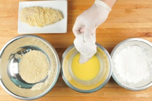 3. Meanwhile, season the chicken breast with salt and pepper. Prepare 3 containers: put breadcrumbs in one, beat the eggs in the second, and fill the third with flour.