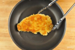 4. First dip the chicken in flour, then in egg, and finally in breadcrumbs. Now fry the schnitzel in heated oil for 5 minutes on each side.