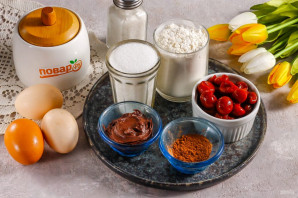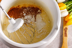 Куриные яйца вбейте в емкость кухонного комбайна или миксера и взбейте с сахаром и солью в пышную пену примерно 5 минут. Затем всыпьте в массу пшеничную муку частями и вмешайте ее. Добавьте шоколадную пасту и какао-порошок. Вмешайте их аккуратно.