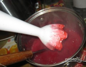 5. When it's ready, mash the berries with a potato masher, then blend them with a blender until smooth. After that, I strain the berries through a sieve, return them to the saucepan, and bring to a boil.