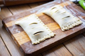 Накройте начинку свободной частью теста и закрепите края вилкой, формируя заготовку будущей слойки.