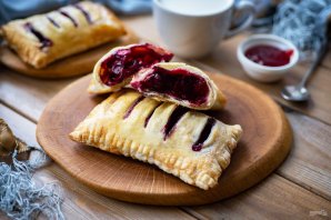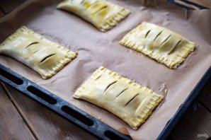 Немного припылите мукой рабочую поверхность и раскатайте размороженное слоеное тесто в прямоугольный пласт толщиной примерно в 2 мм. Затем этот пласт нарежьте на одинаковые прямоугольники. У меня получилось 6 штук. На каждый прямоугольник теста выложите 1 столовую ложку вишневой начинки, как показано на фото. На свободной части теста сделайте несколько надрезов.