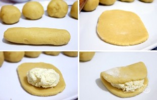 5. Тесто разделите на 6 одинаковых частей. Скатайте сначала колбаску, а после раскатайте лепешку. Выложите начинку и аккуратно сверните тесто пополам, как на фото.