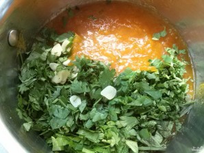 5. Chop parsley, dill, and cilantro. If you don't like cilantro, use basil instead. Peel and mince garlic. Add it to the puree and mix well.