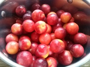 Prepare the cherry plums: remove the stems, rinse under cold water, place in a heavy-bottomed saucepan, and add a little water.