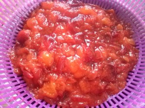 Drain the plums into a colander (or sieve). If the plums are juicy, a lot of juice will drain off; I keep half of the juice and use the rest for making jam. Let the plums cool slightly, then mash them. Only the pits and skins will remain in the colander.