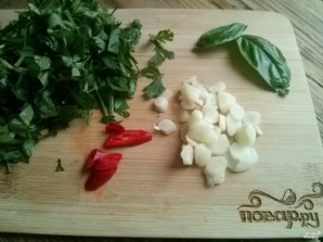Chop the herbs, garlic, and pepper. Add them to the sauce and simmer for another 5 minutes.