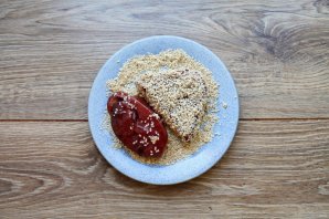 В тарелку насыпьте кунжут, выложите замаринованные стейки и полностью покройте их семенами.