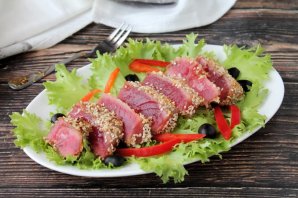 Блюдо готовится без лишних сложностей. Размораживать стейки тунца нужно на нижней полке холодильника и обязательно обсушивайте их от лишней влаги. Количество маринада может понадобиться больше, все зависит от размера стейков, но пропорции всегда должны быть следующими — 1 часть растительного масла и 2 части соевого соуса. Не держите тунец долго в маринаде, он быстро его впитывает, и мясо будет испорчено. И не жарьте его долго, стейки должны оставаться сырыми в середине, тогда вкус раскроется полностью. Подавать тунец лучше всего с салатом или зеленью Готовое блюдо можно подавать к столу.