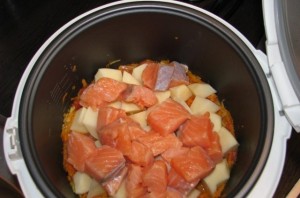 3. When the vegetables are almost ready, add medium-sized pieces of fillet and potatoes cut into small pieces.