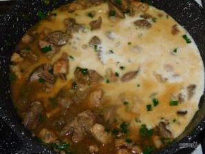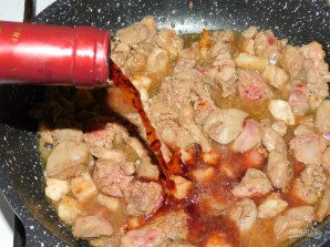 The recipe won't take much time. The pork and chicken liver in a wine-cream sauce make a very tasty gravy, which can be served with any side dish, such as mashed potatoes, buckwheat, rice, or couscous. Garnish with fresh herbs before serving and serve hot.