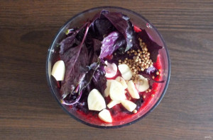 Remove basil leaves from the stems. Peel the garlic and cut it into pieces. Transfer everything to the blender bowl along with the chopped cherries. Add coriander seeds. Blend until smooth.