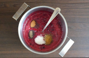 After boiling, reduce the heat to minimum. Add salt, sugar, red and black pepper. Simmer from the moment it starts boiling for 5 minutes.
