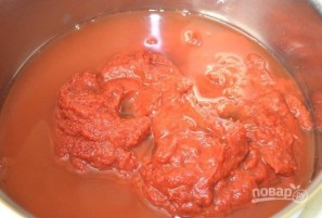 2. Pour water into the saucepan with the tomato paste and stir. Place the saucepan on the stove.