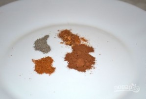 3. Measure out the required amount of spices and salt: 1 teaspoon of salt, a pinch of red ground pepper, ground black pepper, a pinch of cinnamon, and a mixed pepper blend.