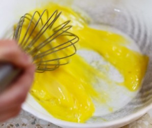 Дрожжи разводим в теплом молоке, добавляем сахар и 2 столовые ложки муки, перемешиваем, накрываем пищевой пленкой и оставляем на 10 минут. В отдельную миску разбиваем 2 яйца и взбиваем их венчиком.