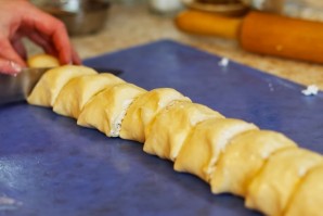 Теперь нарезаем этот рулет на небольшие куски примерно по 2-3 сантиметра шириной.