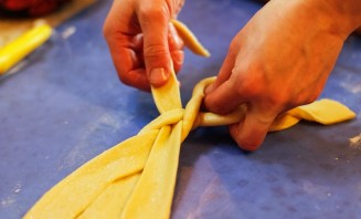 К оставшемуся кусочку теста добавляем еще немного муки, раскатываем его и делаем из него косичку - это будет наше украшение.