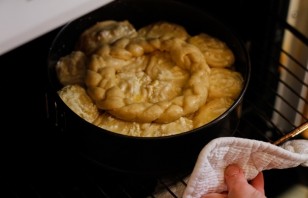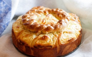 Выкладываем косичку в форму на пирог, накрываем форму пищевой пленкой и ставим на 15 минут в теплое место.