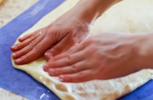 Отделяем от теста небольшой кусочек на украшение тутманика, а остальное тесто выкладываем на смазанную поверхность, поливаем его остатками масла и аккуратно растягиваем руками в тонкий пласт шириной в 1 сантиметр.