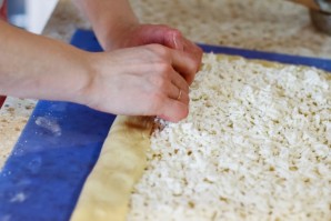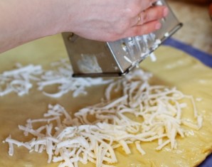 Этот пласт мы посыпаем тертой на крупной терке брынзой, оставляя по 2 сантиметра с краев.